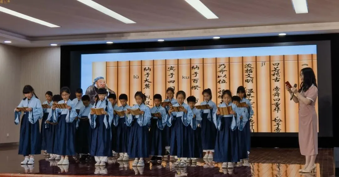 伴随着台上王坛镇中心小学的同学们《舜典》的朗诵声,大学生们运用自身专业特色,以传说故事、典故记载为切入,为同学们讲述虞舜的孝德精神,描绘了一个异彩纷呈的大世界,呈现了古时虞舜祭祀大典的盛况,更是展现了当地百姓对虞舜美德的敬仰。