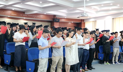 全体毕业生在领誓人带领下跟读“中小学教师职业道德规范”,伴随着《我们是光荣的人民教师》悠扬而又动听的音乐声,全体数学专业师范生作出了庄严而又神圣的宣誓。