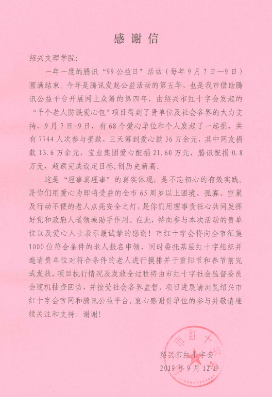 近日,我校收到来自绍兴市红十字会的感谢信。公益志愿活动的开展,不仅是大学生感恩社会,弘扬社会主义核心价值观的有效途径,更是我校践行立德树人根本任务的重要载体。