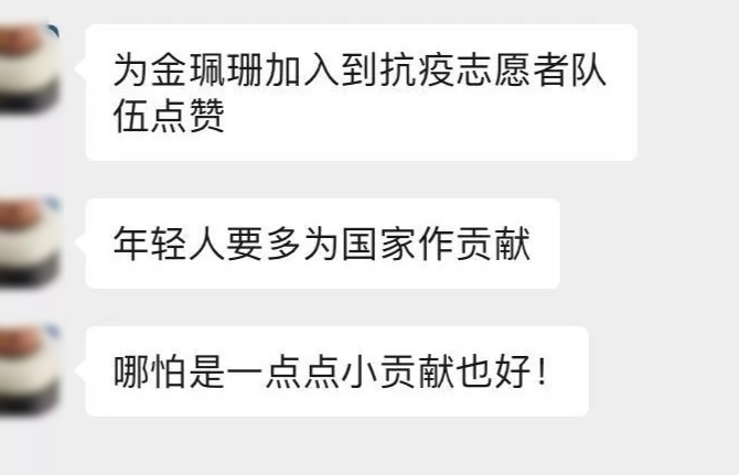工程管理171班的班长董晶晶同学,在疫情期间一直积极协助辅导员、班主任做好班级的每日信息排查与统计工作。当看到学校学院发起的疫情防控志愿倡议时,她第一时间联系到所在村的党委书记,立刻报名参加志愿服务。在确保身体健康的前提下,她以学生党员志愿者身份参与到宁波市奉化区大堰镇后畈村的疫情联防联控工作,配合当地村委做好村民的舆论引导和有关政策的宣传解读。她表示,作为学生党员、班级干部,在疫情面前,理应冲锋在前、勇于担当;我们坚守好自己的岗位,做好力所能及的志愿服务工作,就是以自己的行动为疫区支援!