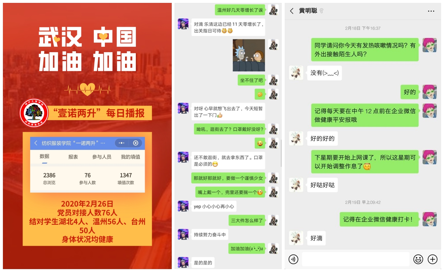 自疫情发生后,纺织服装学院党员之家迅速发起了新型肺炎疫情防控时期“壹诺两升”的活动。全体学生党员迅速响应,做出郑重承诺。一是党员承诺结对一个班级,指导结对班级开展疫情防控期间的信息排查与相关疫情防护知识的宣传工作;二是党员承诺结对1-2名重点疫情地区学生,了解结对学生的生活、心理、学习状态,并进行关怀帮扶。活动开展20多天来,学院76名学生党员主动承担,共结对26个班级和110名在湖北、温州、台州等重疫区学生,累计上报结对学生的身心健康以及学习、生活情况达1347次。