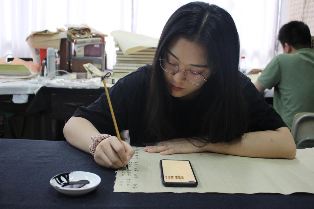 毕业生名录作为档案资料,要求准确性与艺术性共存。为确保名录书写的准确性,需先设计小稿,其中名录的章法设计是难点,要随人数变化的而改变,大家经过“云讨论”集思广益、群策群力,几易其稿,为各班毕业生设计出了与众不同的章法形式。书写需要每位同学、每个小组之间的相互协作,有一笔写错就要重新开始,且要求书体统一,书写过程不得有一丝马虎。