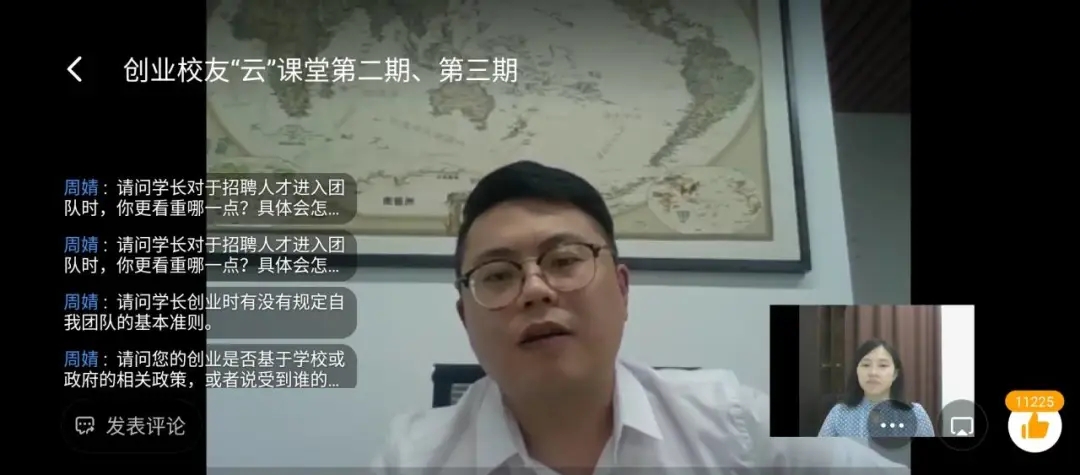 提问互动环节,在线观看直播的同学们踊跃发言、积极提问,三位校友认真聆听、耐心解答。