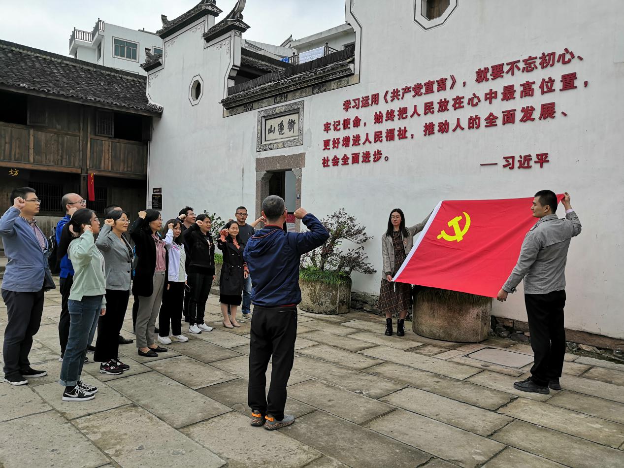 红色之旅首站是位于义乌市城西街道分水塘村的陈望道故居。在《共产党宣言》中文首译本出版100周年之际,全体师生党员走入陈望道同志翻译《共产党宣言》的染坊和故居,感受陈望道先生为中国之崛起而奋斗的热情,重走信仰之路,寻悟初心之旅。参观结束后,全体师生党员在刻有习近平总书记对于如何学习《共产党宣言》的论述墙下庄严宣誓,每一个高高举起的右拳、每一句铿锵有力的誓言都传递着党员同志们的初心和使命。