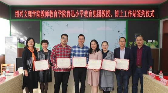10月23日下午,教师教育学院和鲁迅小学教育集团合作的教授、博士工作站签约仪式在在市区鲁迅小学和畅堂校区举行,这也是我市首个小学教授工作站。绍兴市越城区教体局副局长孙建林、教师教育学院院长陈巍、副院长刘雄英、绍兴市鲁迅小学教育集团(总校)校长王慧琴、鲁迅小学教育集团董事会成员以及双方教师代表参加了此次签约仪式。