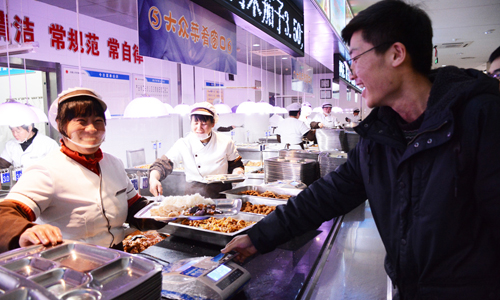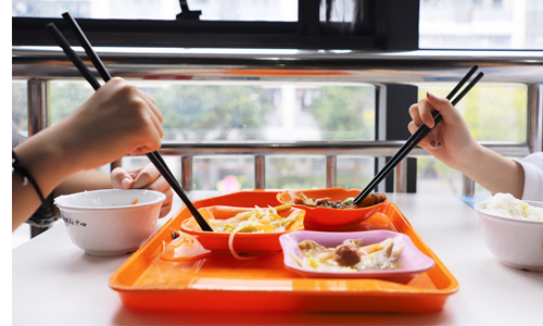“阿姨,饭少一点。”在打饭时,不少同学都主动向食堂阿姨提出要求