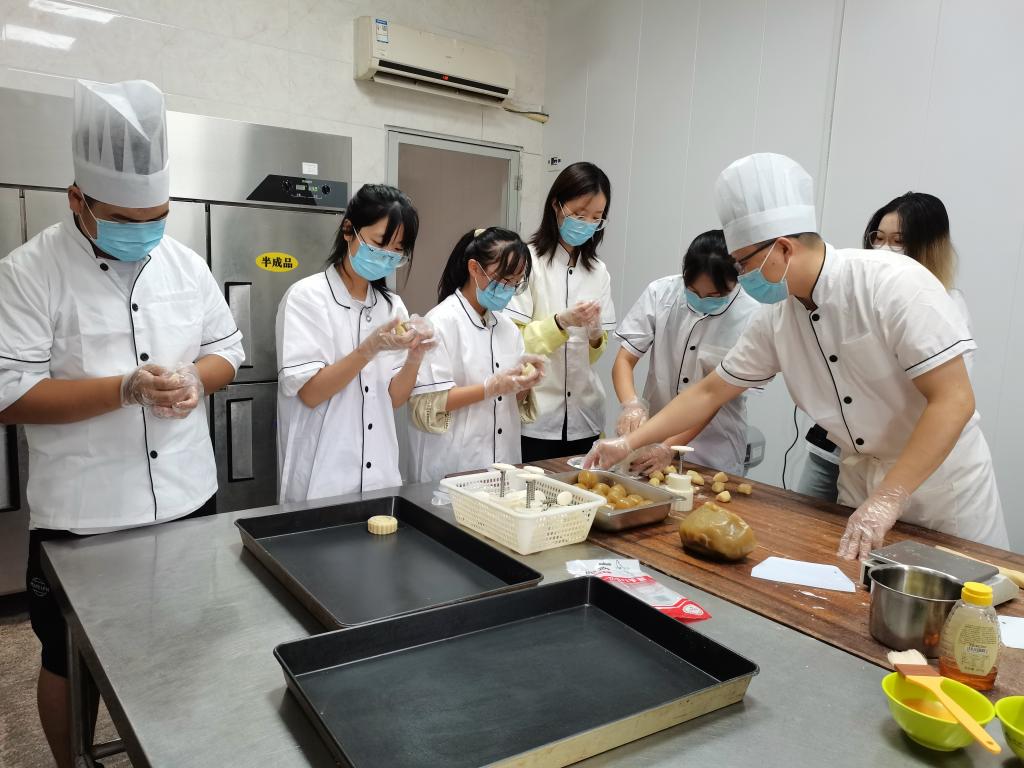 活动现场,工作人员提前精心准备了所需面粉、馅料和模具。专业的面点师傅详细讲解制作月饼的方法、配料比例并做示范。在制作环节,大家带好手套,按照师傅教学的步骤,做面团、按面皮、装馅、封口、套模具、成型,经过烤箱的加工,一个个散发浓浓香气的月饼就完成了,现场爆发出一阵阵欢声笑语,大家纷纷掏出手机拍照发圈,再带着自己亲制的月饼与未到场的同学分享。