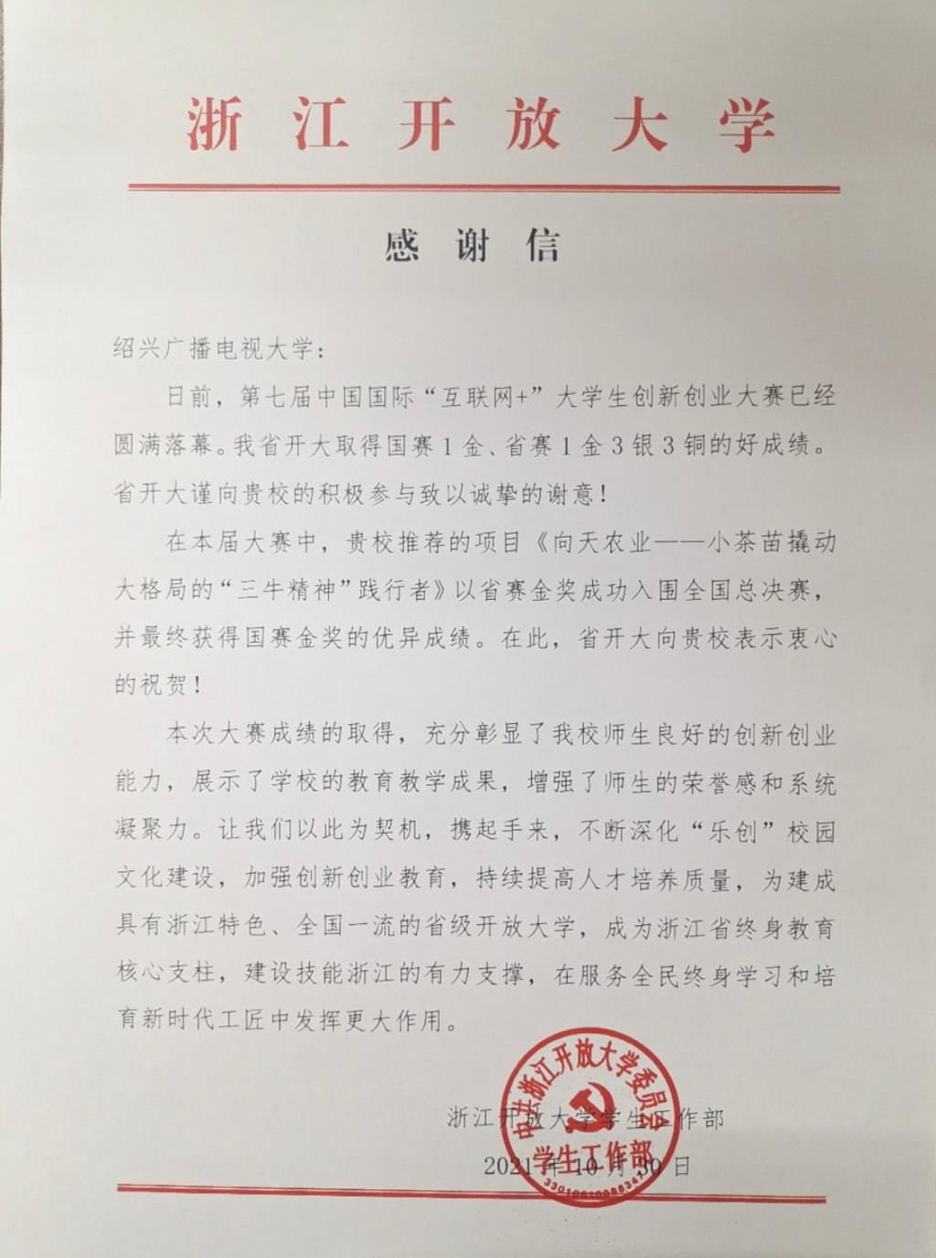 近日,浙江开放大学向我校电大发来感谢信,对我校电大推荐的项目《向天农业:小茶苗撬动大格局的“三牛精神”践行者》以省赛金奖成功入围第七届中国国际“互联网+”大学生创新创业大赛全国总决赛并最终获得国赛金奖的优异成绩表示祝贺,对我校电大的积极参与表示诚挚的谢意。