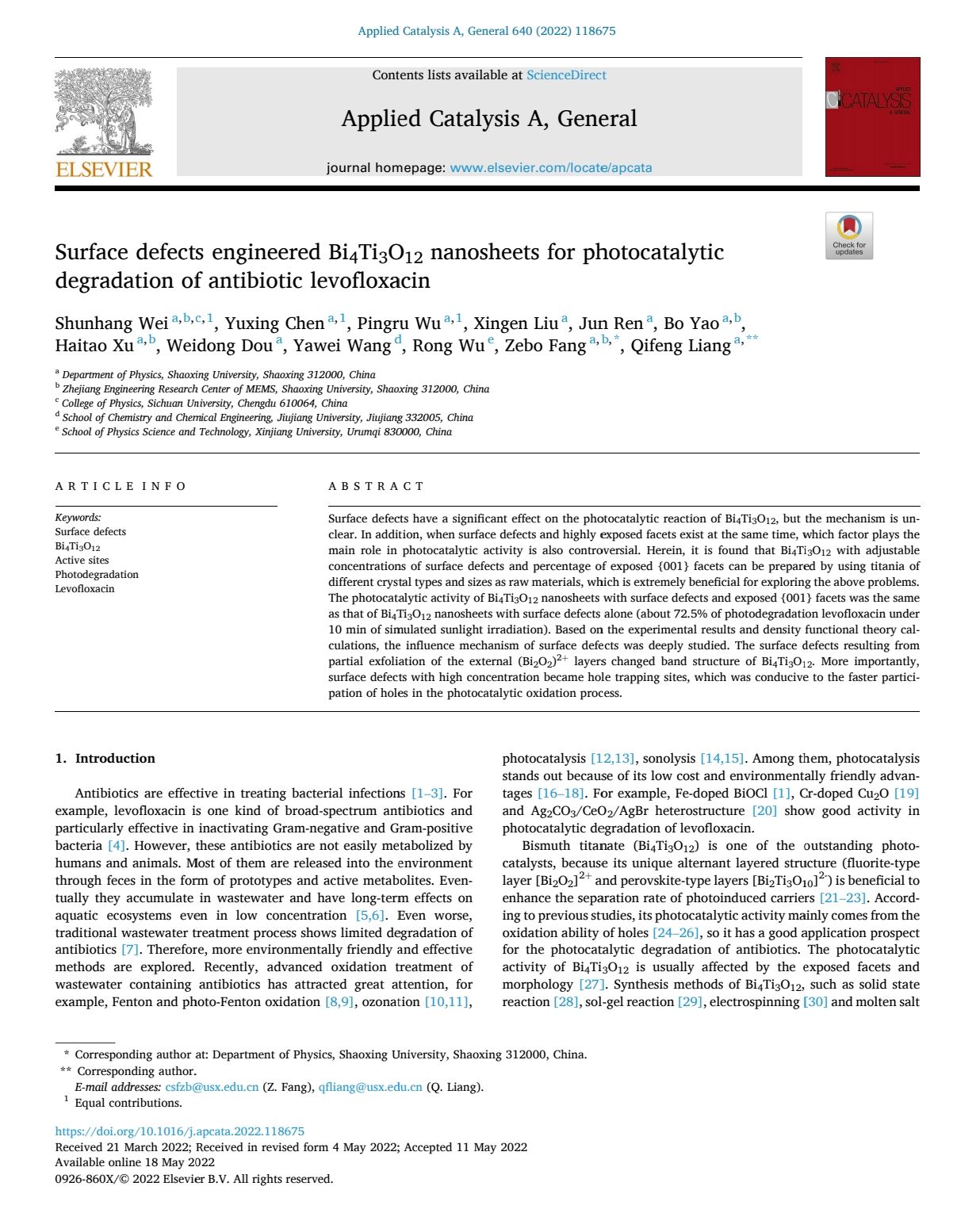 近日,数理信息学院微电子科学与工程191班陈禹行同学以共同第一作者在SCI二区收录期刊《Applied Catalysis A-General》发表学术论文《Surface defects engineered Bi4Ti3O12 nanosheets for photocataly degradation of antibiotic levofloxacin》。《Applied Catalysis A-General》是主要收录对催化剂、催化反应新理解,包括新催化材料、新技术和新工艺等相关学术论文,影响因子为5.706。方泽波教授和梁奇峰教授为本文的共同通讯作者。