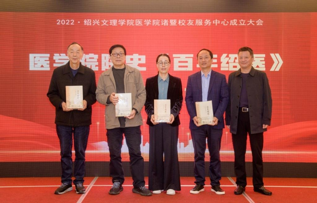 沈赤为校友代表赠送医学院院史《百年绍医》。
