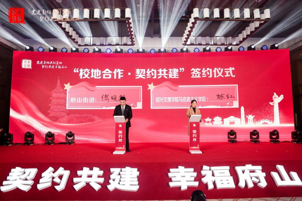 “党建引领促发展,共建共享出成果……”随着主持人话落,马克思主义学院党委与府山街道党工委“校地合作·契约共建”签约正式完成。2月23日,马克思主义学院党委参加府山街道契约共建大会暨党建联建启动仪式,就深化产业强体工程、擦亮契约共建金名片、共同续写“社会治理现代化”达成进一步共识。