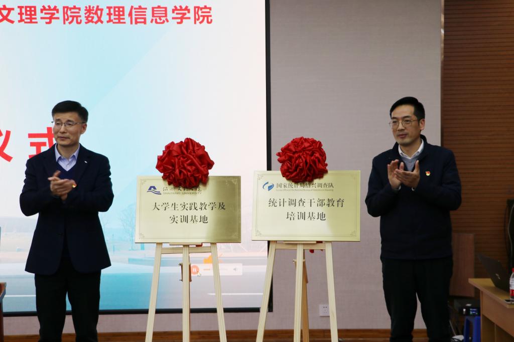 数理信息学院院党委书记史正东与张国苗代表双方签订党建联建人才共育“双向提升工程”合作框架协议,并分别为“大学生实践教学与实训基地”和“统计调查干部教育培训基地”揭牌。数理信息学院党委委员、副院长窦卫东为国家统计局绍兴调查队办公室主任吴啸滇、农业农村调查处处长周俊杰颁发校外兼职实践导师聘书。