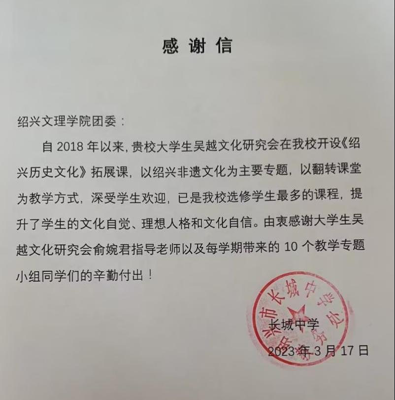 我校大学生吴越文化研究会,在俞婉君老师的悉心指导下,以中学生喜闻乐见的形式推动地方优秀传统文化进校园。社团在长城中学开设的《绍兴历史文化》选修人数已从原有的20多人扩展为90多人,同时为满足中学生的需求实现了两个学期的覆盖。