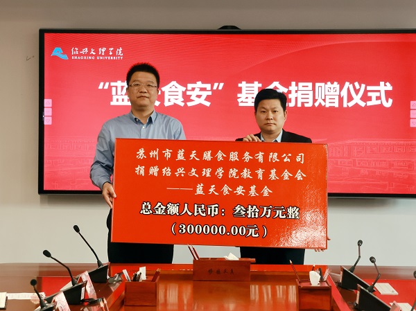 11月22日下午,“蓝天食安基金”捐赠仪式在行政楼东418会议室举行。校党委副书记沈赤、副校长陈均土,苏州市蓝天膳食服务有限公司董事夏天、总经理王磊、副总经理王月月,校地方服务与合作处(校友办、教育基金会)、资产与后勤管理处负责人及食堂代表等参加捐赠仪式。“蓝天食安基金”由苏州市蓝天膳食服务有限公司设立,捐赠金额总计30万元整,主要用于学校自营食堂员工用工安全保障。
