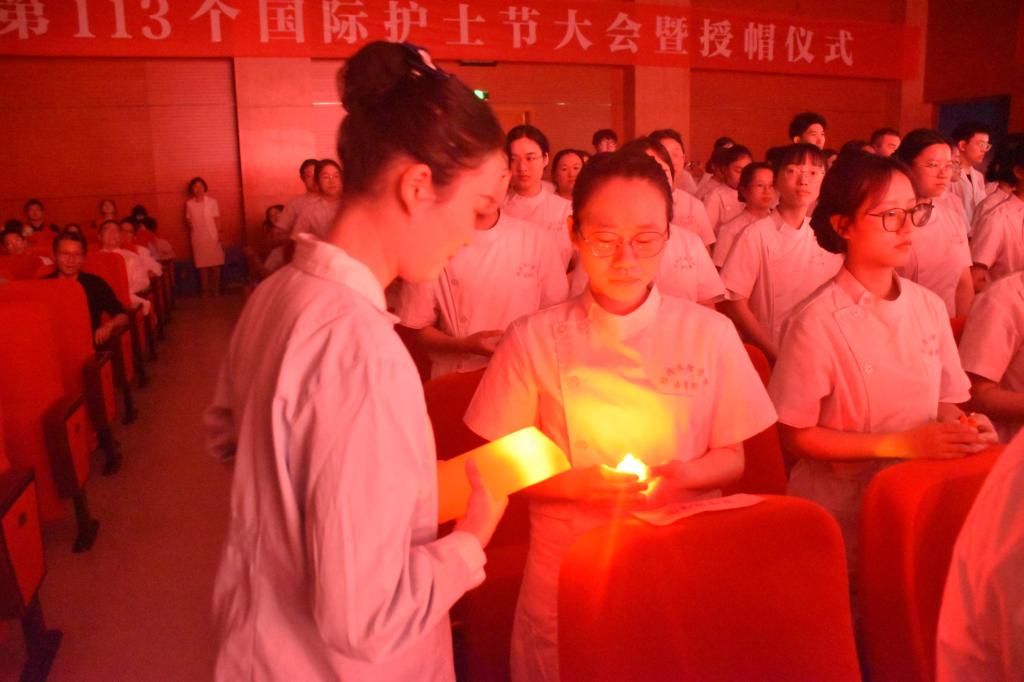 在授帽仪式上,最美护士代表滕斯斯、裘万民为学生点燃象征着南丁格尔精神的红色蜡烛,并依次传灯,点亮了现场所有护生手中的蜡烛;5位护理前辈和十佳护士长为现场所有学生代表授帽,氛围格外庄严而神圣。
