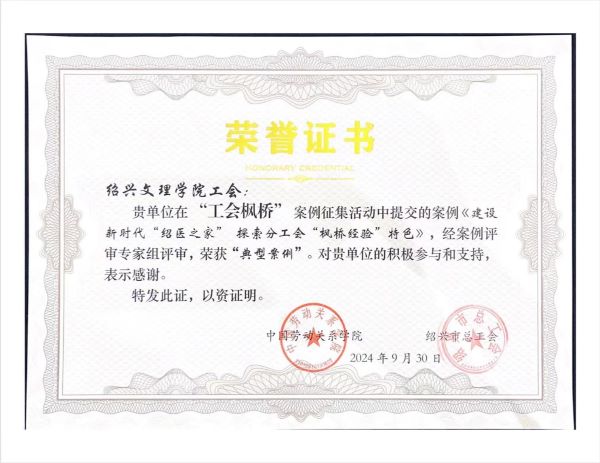 10月10日,在绍兴市总工会组织召开的“枫桥经验”工作实践暨新时代 “枫桥经验”交流会上,由校工会选送的《建设新时代“绍医之家” 探索分工会“枫桥经验”特色》获评“枫桥经验”工会实践浙江省典型案例。