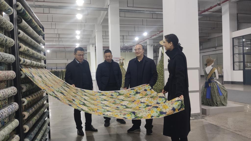 在企业生产车间和产品展示中心,黄坚一行详细听取企业产品研发、市场开拓、技术创新等介绍,观看数码印花图案、布料图案,了解花式设计图案和成衣产品国外销售情况。