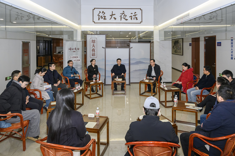 12月5日晚,“绍大夜话”第二十三期“同心夜话”第二期在行政楼三楼中庭举行。校党委书记崔凤军和党外知识分子代表面对面,解读党的二十届三中全会精神,共同交流心得体会。活动由校党委副书记张宏主持。办公室、统战部负责人参加活动。