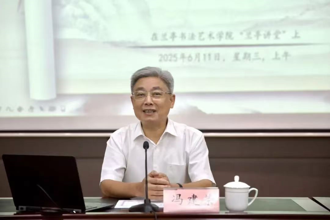 6月11日上午,兰亭书法艺术学院主办的第15期“兰亭讲堂”在学院报告厅举行。地方文史与文化遗产保护研究专家、绍兴市文史研究馆馆长冯建荣先生受邀作题为 “书法蕴文史——以‘鸟虫书’、《李斯碑》《兰亭序》为例” 的专题讲座。讲座由兰亭书法艺术学院党委书记孙仕龙主持,院长刘小华及学院师生200余人参加讲座。
